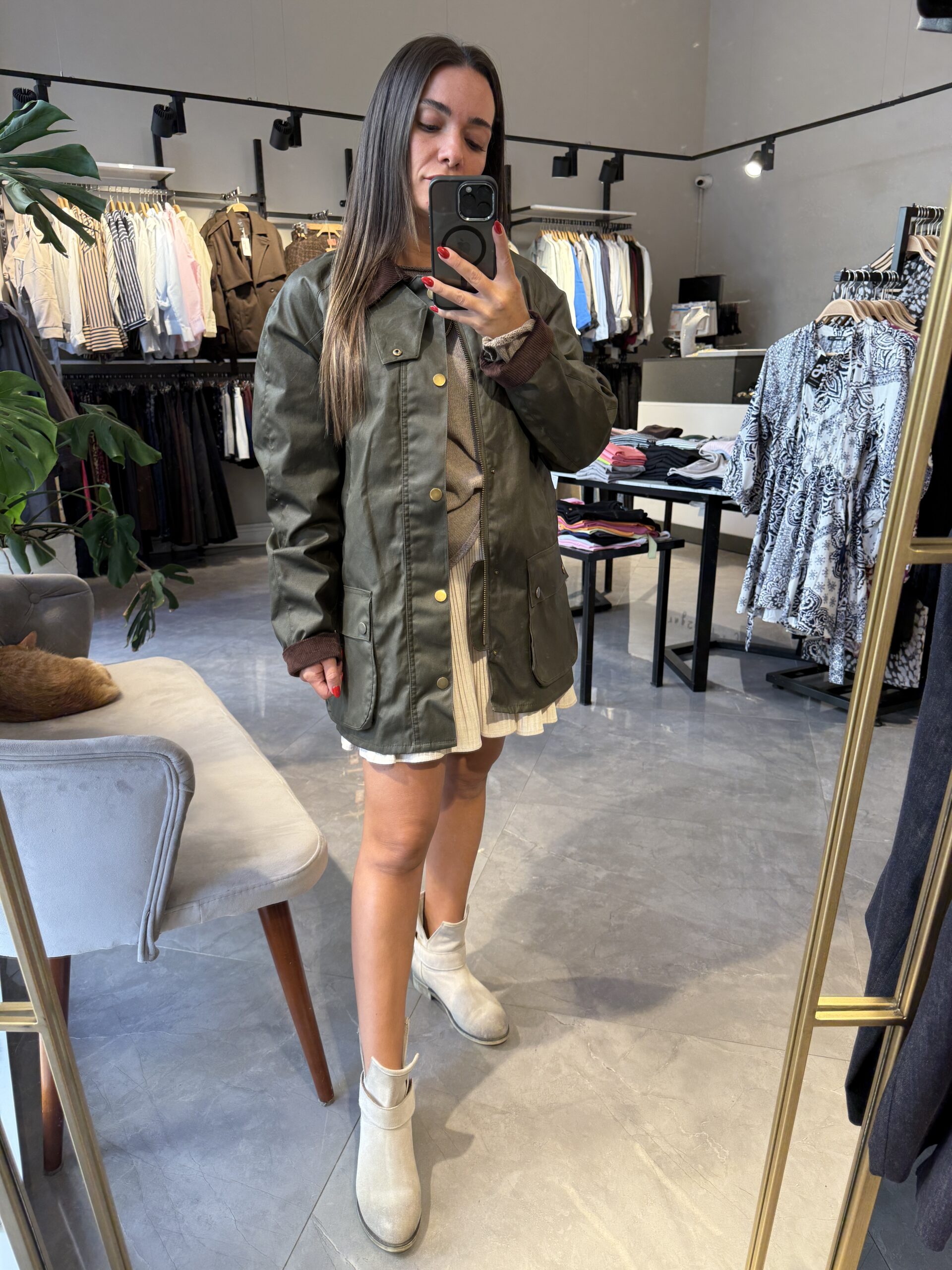 MUMLU KUMAŞ ÖNDEN CEPLİ KISA TRENÇ